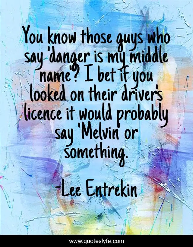 This page presents the quote "You know those guys who say 'danger is my middle name'? I bet if you looked on their driver's licence it would probably say 'Melvin' or something.". Author of this quote is Lee Entrekin. This quote is about image, danger,.