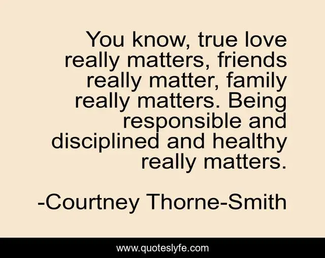 This page presents the quote "You know, true love really matters, friends really matter, family really matters. Being responsible and disciplined and healthy really matters.". Author of this quote is Courtney Thorne-Smith. This quote is about health, friends, affection, love,.