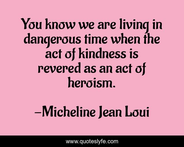 This page presents the quote "You know we are living in dangerous time when the act of kindness is revered as an act of heroism.". Author of this quote is Micheline Jean Loui. This quote is about life, dangerous, motivation, heroism, life-lessons, time, kindness, inpirational,.