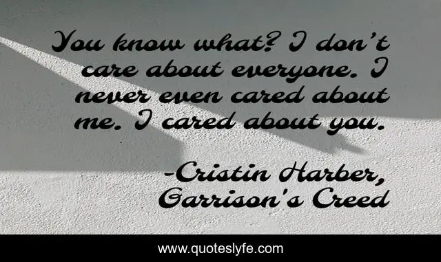 This page presents the quote "You know what? I don’t care about everyone. I never even cared about me. I cared about you.". Author of this quote is Cristin Harber, Garrison's Creed. This quote is about swoonworthy, sweet, alpha-male, military-romance, romantic-suspense, alpha-male-romance,.
