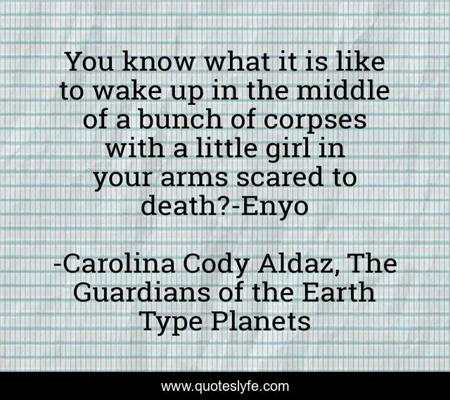 This page presents the quote "You know what it is like to wake up in the middle of a bunch of corpses with a little girl in your arms scared to death?-Enyo". Author of this quote is Carolina Cody Aldaz, The Guardians of the Earth Type Planets. This quote is about cyberspace, dying-earth, dystopian-novel, science-fiction, science-fiction-fantasy, cyberpunk, adventure-fantasy,.