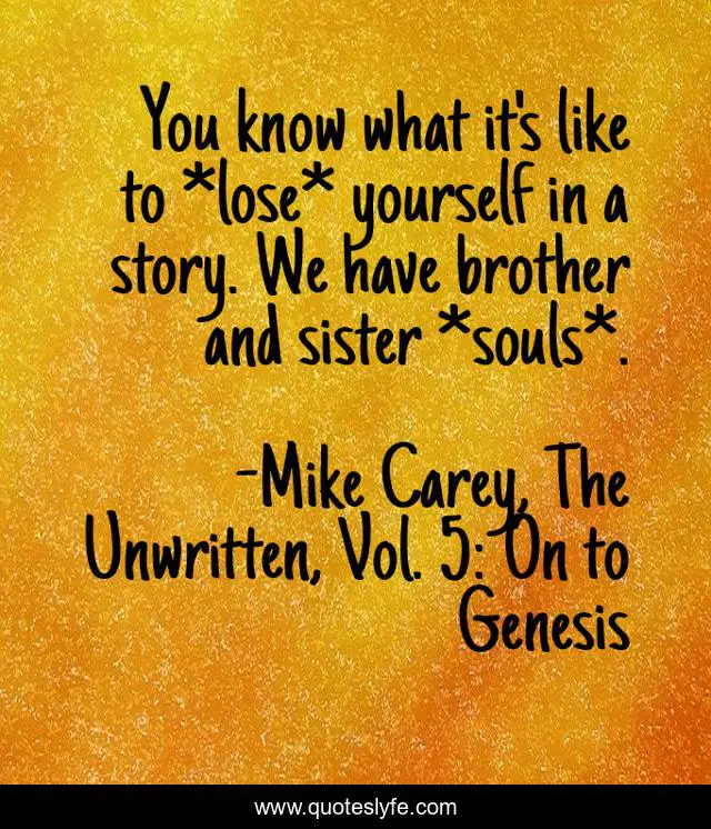 This page presents the quote "You know what it's like to *lose* yourself in a story. We have brother and sister *souls*.". Author of this quote is Mike Carey, The Unwritten, Vol. 5: On to Genesis. This quote is about reading, stories,.