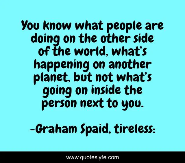 This page presents the quote "You know what people are doing on the other side of the world, what’s happening on another planet, but not what’s going on inside the person next to you.". Author of this quote is Graham Spaid, tireless:. This quote is about humor, humorous-fiction, satire, literary-fiction,.