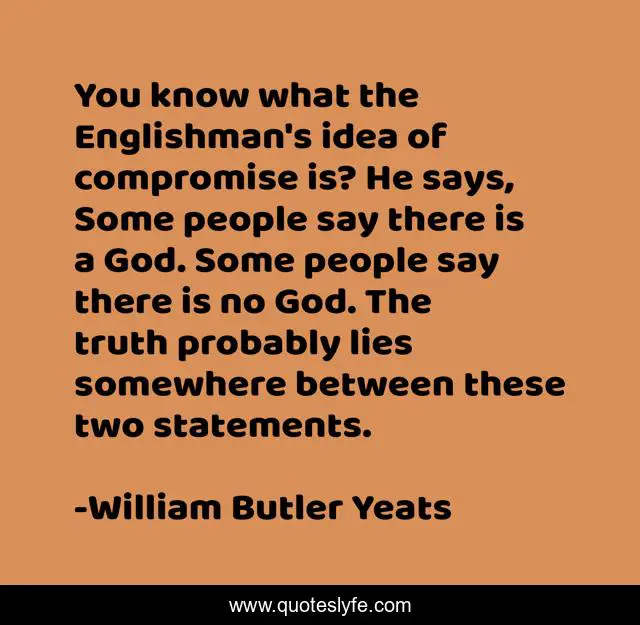 This page presents the quote "You know what the Englishman's idea of compromise is? He says, Some people say there is a God. Some people say there is no God. The truth probably lies somewhere between these two statements.". Author of this quote is William Butler Yeats. This quote is about god, compromise, people,.