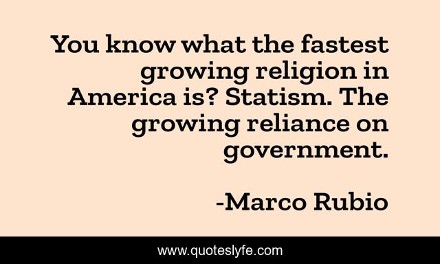 This page presents the quote "You know what the fastest growing religion in America is? Statism. The growing reliance on government.". Author of this quote is Marco Rubio. This quote is about america, government,.