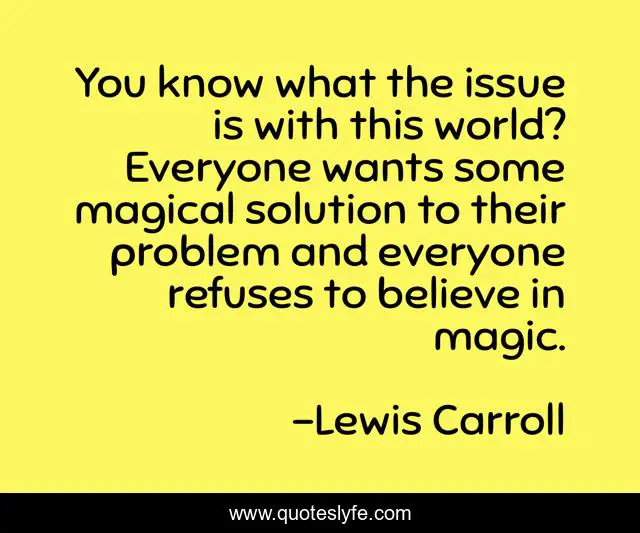 This page presents the quote "You know what the issue is with this world? Everyone wants some magical solution to their problem and everyone refuses to believe in magic.". Author of this quote is Lewis Carroll. This quote is about magic, problems, world,.