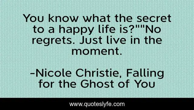 This page presents the quote "You know what the secret to a happy life is?""No regrets. Just live in the moment.". Author of this quote is Nicole Christie, Falling for the Ghost of You. This quote is about young-adult, comedy-romance, young-adult-romance, young-love,.