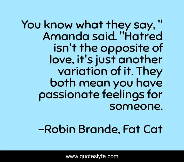 This page presents the quote "You know what they say, " Amanda said. "Hatred isn't the opposite of love, it's just another variation of it. They both mean you have passionate feelings for someone.". Author of this quote is Robin Brande, Fat Cat. This quote is about hate, hatred, love, affection,.