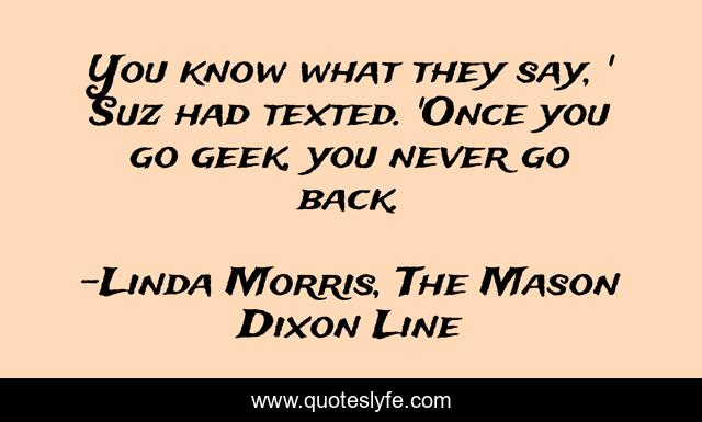 This page presents the quote "You know what they say, ' Suz had texted. 'Once you go geek, you never go back.". Author of this quote is Linda Morris, The Mason Dixon Line. This quote is about new-adult, romance, humor,.
