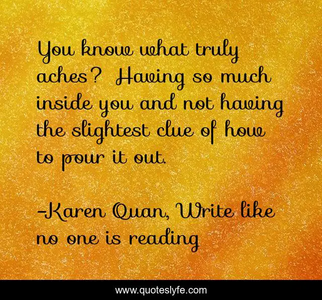 This page presents the quote "You know what truly aches? Having so much inside you and not having the slightest clue of how to pour it out.". Author of this quote is Karen Quan, Write like no one is reading. This quote is about heartache, aches, clueless, bottled-up, inside, sincerity, emotional, love, affection,.