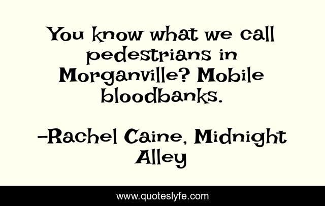 This page presents the quote "You know what we call pedestrians in Morganville? Mobile bloodbanks.". Author of this quote is Rachel Caine, Midnight Alley. This quote is about shane-collins, eve-rosser, vampires, pedestrian, mobile, morganville-vampires, blood, claire-danvers, michael-glass,.