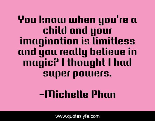 This page presents the quote "You know when you're a child and your imagination is limitless and you really believe in magic? I thought I had super powers.". Author of this quote is Michelle Phan. This quote is about thought, believe, child,.