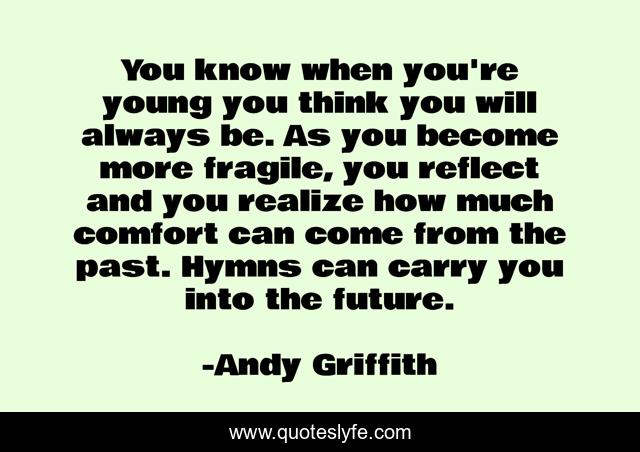 This page presents the quote "You know when you're young you think you will always be. As you become more fragile, you reflect and you realize how much comfort can come from the past. Hymns can carry you into the future.". Author of this quote is Andy Griffith. This quote is about past, comfort,.