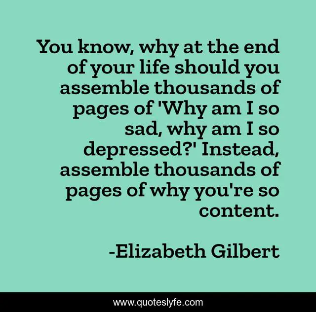 This page presents the quote "You know, why at the end of your life should you assemble thousands of pages of 'Why am I so sad, why am I so depressed?' Instead, assemble thousands of pages of why you're so content.". Author of this quote is Elizabeth Gilbert. This quote is about life, end,.