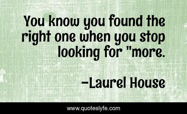 This page presents the quote "You know you found the right one when you stop looking for "more.". Author of this quote is Laurel House. This quote is about the-one, dating, mr-right, husband,.