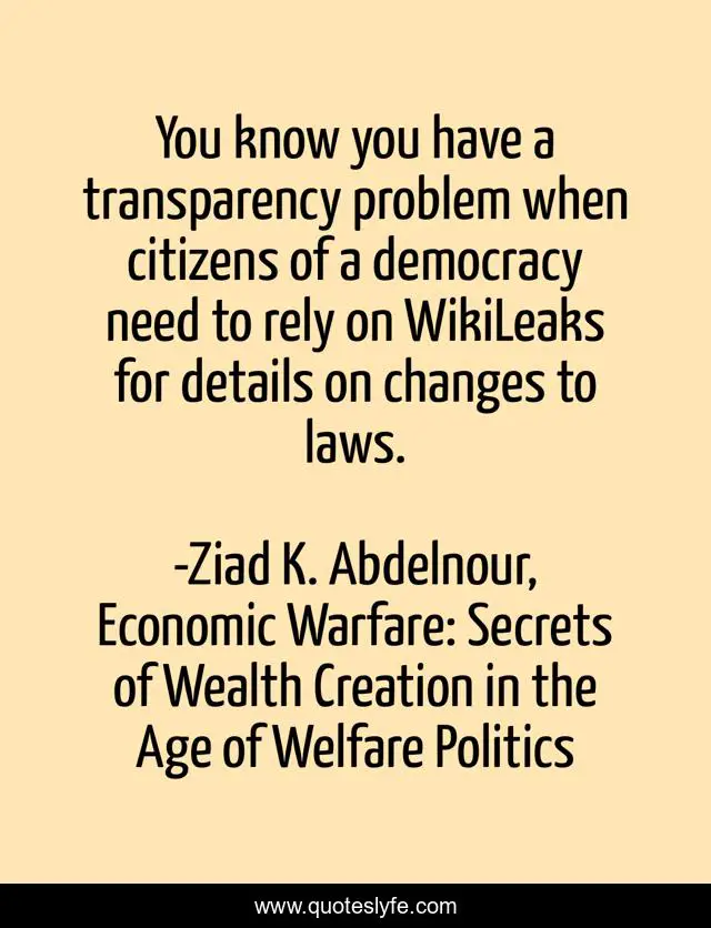 This page presents the quote "You know you have a transparency problem when citizens of a democracy need to rely on WikiLeaks for details on changes to laws.". Author of this quote is Ziad K. Abdelnour, Economic Warfare: Secrets of Wealth Creation in the Age of Welfare Politics. This quote is about wikileaks, democracy, transparency, laws,.