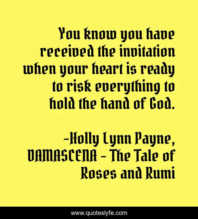 This page presents the quote "You know you have received the invitation when your heart is ready to risk everything to hold the hand of God.". Author of this quote is Holly Lynn Payne, DAMASCENA - The Tale of Roses and Rumi. This quote is about heart, love, risk, rumi, god, spirituality, faith, affection,.