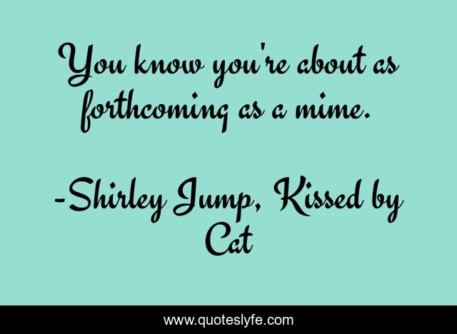 This page presents the quote "You know you're about as forthcoming as a mime.". Author of this quote is Shirley Jump, Kissed by Cat. This quote is about conversation, metaphor, humor, mimes, reticence,.