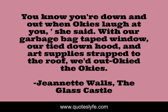 This page presents the quote "You know you're down and out when Okies laugh at you, ' she said. With our garbage bag taped window, our tied down hood, and art supplies strapped to the roof, we'd out-Okied the Okies.". Author of this quote is Jeannette Walls, The Glass Castle. This quote is about poor, oklahoma, down-and-out,.