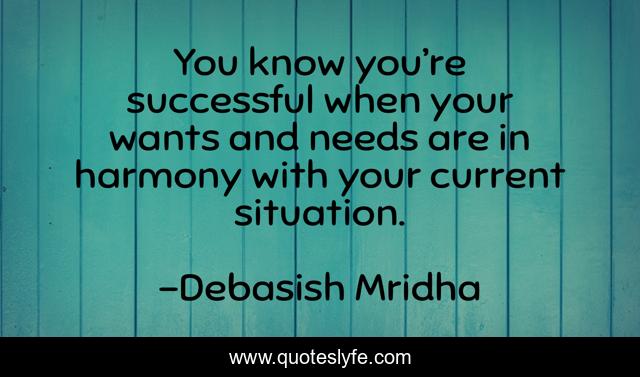 This page presents the quote "You know you’re successful when your wants and needs are in harmony with your current situation.". Author of this quote is Debasish Mridha. This quote is about life, love, knowledge, inspirational, intelligence, philosophy, wisdom, quotes, affection,.