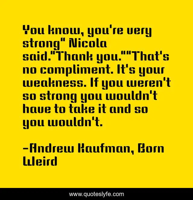 This page presents the quote "You know, you're very strong" Nicola said."Thank you.""That's no compliment. It's your weakness. If you weren't so strong you wouldn't have to take it and so you wouldn't.". Author of this quote is Andrew Kaufman, Born Weird. .