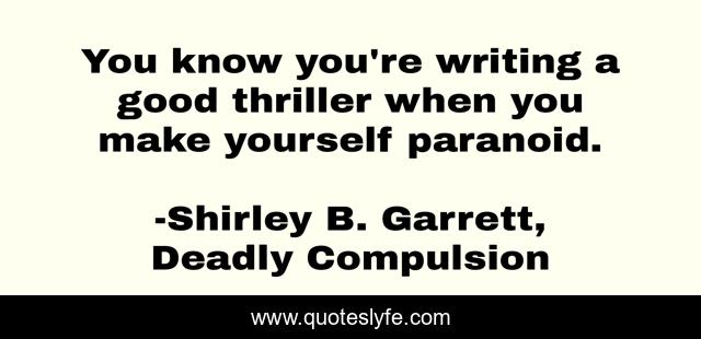 This page presents the quote "You know you're writing a good thriller when you make yourself paranoid.". Author of this quote is Shirley B. Garrett, Deadly Compulsion. This quote is about thriller-mystery, crime,.