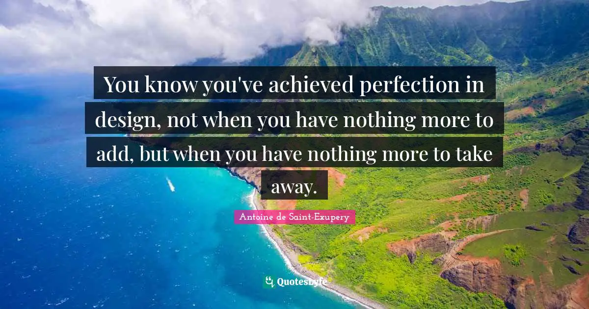 This page presents the quote "You know you've achieved perfection in design, not when you have nothing more to add, but when you have nothing more to take away.". Author of this quote is Antoine de Saint-Exupery. This quote is about peace, inspiring, perfection, add, design, ubuntu,.