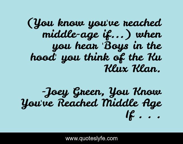 This page presents the quote "(You know you've reached middle-age if...) when you hear 'Boys in the hood' you think of the Ku Klux Klan.". Author of this quote is Joey Green, You Know You've Reached Middle Age If . . .. .