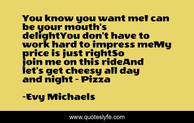 This page presents the quote "You know you want meI can be your mouth's delightYou don't have to work hard to impress meMy price is just rightSo join me on this rideAnd let's get cheesy all day and night - Pizza". Author of this quote is Evy Michaels. This quote is about cheese, food-for-thought, food, pizza-love, cheesy, pizza,.