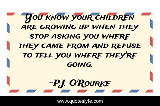 This page presents the quote "You know your children are growing up when they stop asking you where they came from and refuse to tell you where they're going.". Author of this quote is P.J. O'Rourke. This quote is about parenthood, growing-up,.