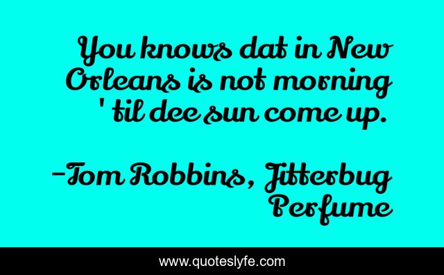 This page presents the quote "You knows dat in New Orleans is not morning 'til dee sun come up.". Author of this quote is Tom Robbins, Jitterbug Perfume. This quote is about new-orleans, relativity, morning, time, night,.