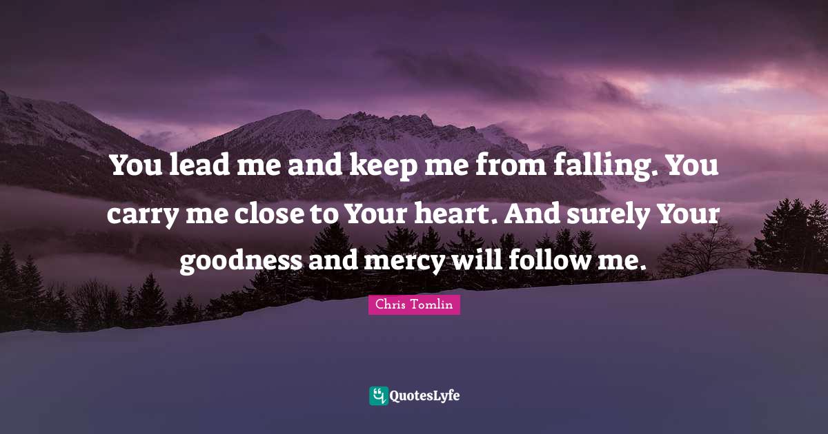 This page presents the quote "You lead me and keep me from falling. You carry me close to Your heart. And surely Your goodness and mercy will follow me.". Author of this quote is Chris Tomlin. This quote is about heart, fall, follow me, mercy, goodness,.
