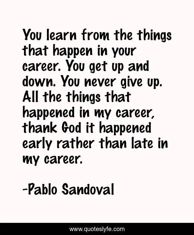 This page presents the quote "You learn from the things that happen in your career. You get up and down. You never give up. All the things that happened in my career, thank God it happened early rather than late in my career.". Author of this quote is Pablo Sandoval. This quote is about thank god, never give up,.