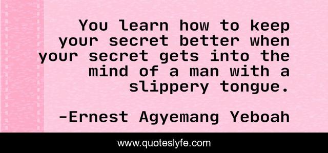 This page presents the quote "You learn how to keep your secret better when your secret gets into the mind of a man with a slippery tongue.". Author of this quote is Ernest Agyemang Yeboah. This quote is about disloyalty, failure-and-attitude, secrets, painful-memories, betrayal, disappointment, the-tongue,.