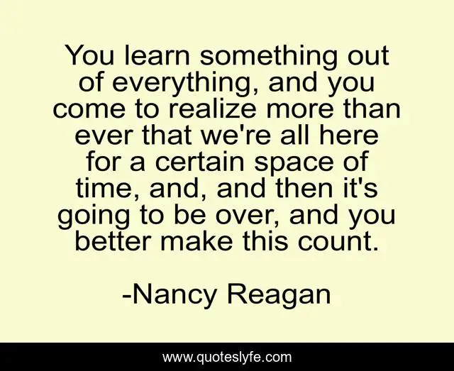 This page presents the quote "You learn something out of everything, and you come to realize more than ever that we're all here for a certain space of time, and, and then it's going to be over, and you better make this count.". Author of this quote is Nancy Reagan. This quote is about better, time,.