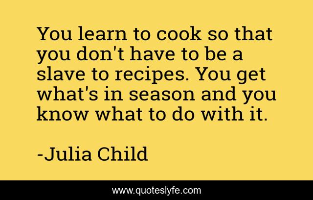 This page presents the quote "You learn to cook so that you don't have to be a slave to recipes. You get what's in season and you know what to do with it.". Author of this quote is Julia Child. .