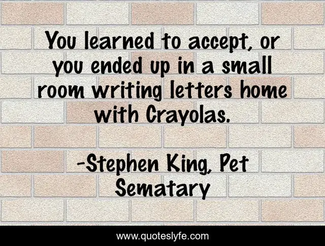 This page presents the quote "You learned to accept, or you ended up in a small room writing letters home with Crayolas.". Author of this quote is Stephen King, Pet Sematary. This quote is about acceptance, insanity,.