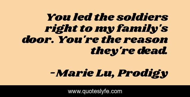This page presents the quote "You led the soldiers right to my family's door. You're the reason they're dead.". Author of this quote is Marie Lu, Prodigy. This quote is about blame, june, day,.