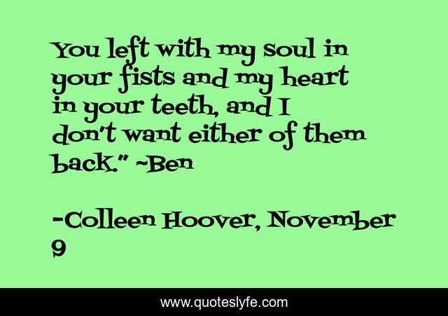 This page presents the quote "You left with my soul in your fists and my heart in your teeth, and I don’t want either of them back.” ~Ben". Author of this quote is Colleen Hoover, November 9. This quote is about heartbreak, love, affection,.