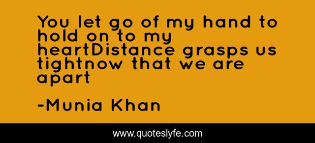 This page presents the quote "You let go of my hand to hold on to my heartDistance grasps us tightnow that we are apart". Author of this quote is Munia Khan. This quote is about distance, we, lovers, love, heart, far, letting-go, us, hand,.
