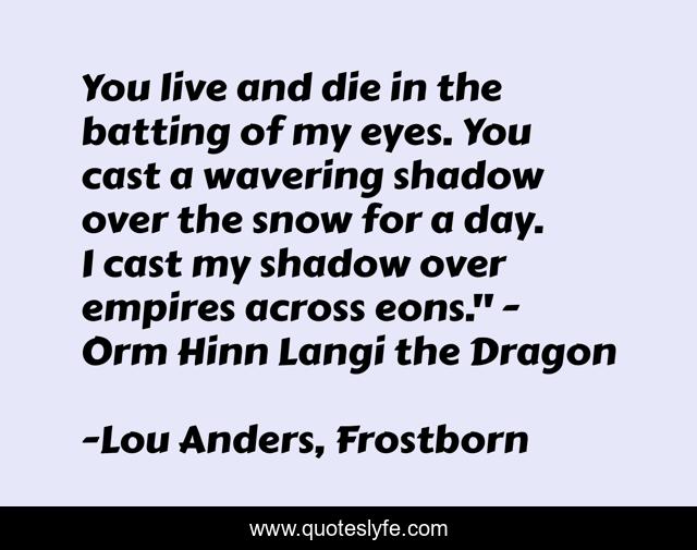 This page presents the quote "You live and die in the batting of my eyes. You cast a wavering shadow over the snow for a day. I cast my shadow over empires across eons." - Orm Hinn Langi the Dragon". Author of this quote is Lou Anders, Frostborn. This quote is about fantasy, childrens-books, dragon,.