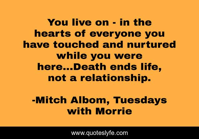 This page presents the quote "You live on - in the hearts of everyone you have touched and nurtured while you were here...Death ends life, not a relationship.". Author of this quote is Mitch Albom, Tuesdays with Morrie. This quote is about relationships, life, love, death-and-dying, affection,.