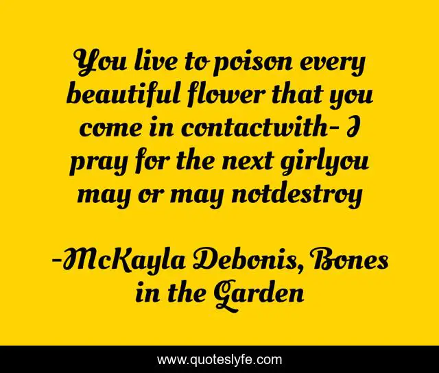 This page presents the quote "You live to poison every beautiful flower that you come in contactwith- I pray for the next girlyou may or may notdestroy". Author of this quote is McKayla Debonis, Bones in the Garden. .
