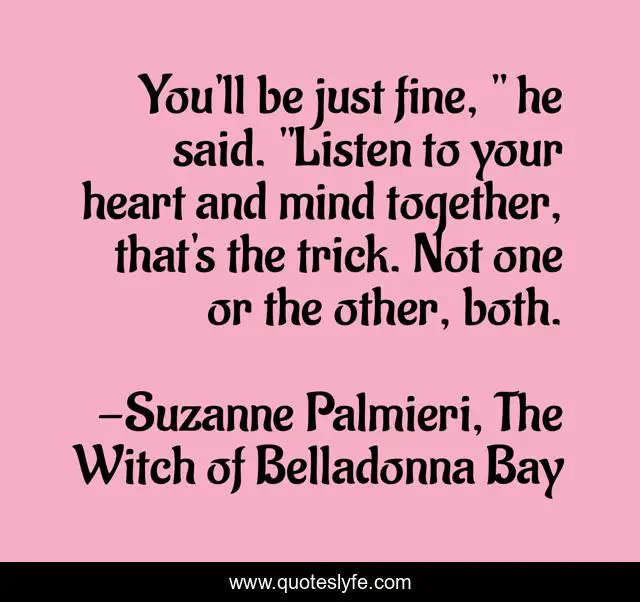 This page presents the quote "You'll be just fine, " he said. "Listen to your heart and mind together, that's the trick. Not one or the other, both.". Author of this quote is Suzanne Palmieri, The Witch of Belladonna Bay. .