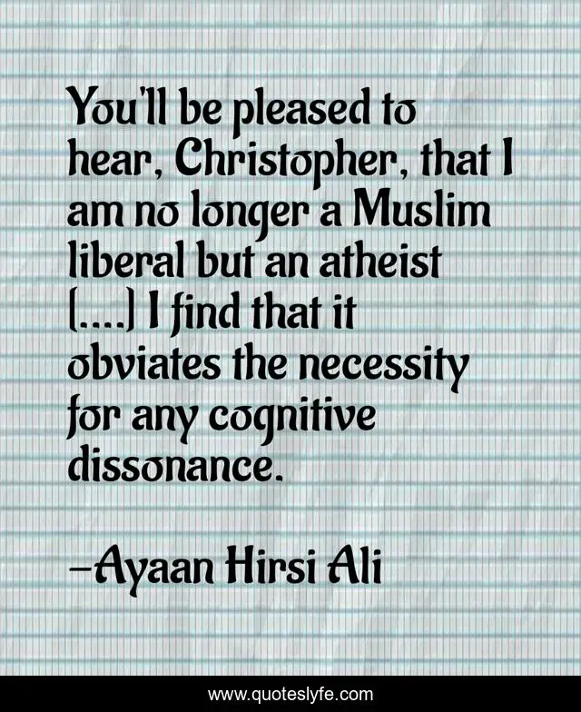 This page presents the quote "You'll be pleased to hear, Christopher, that I am no longer a Muslim liberal but an atheist [....] I find that it obviates the necessity for any cognitive dissonance.". Author of this quote is Ayaan Hirsi Ali. This quote is about atheism, christopher-hitchens, religious-liberalism, islam,.