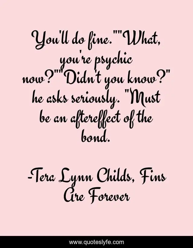 This page presents the quote "You'll do fine.""What, you're psychic now?""Didn't you know?" he asks seriously. "Must be an aftereffect of the bond.". Author of this quote is Tera Lynn Childs, Fins Are Forever. This quote is about lily-sanderson, ya-romance, quince-fletcher, mermaid-romance, fins, romance, mermaids, fins-are-forever, quince,.