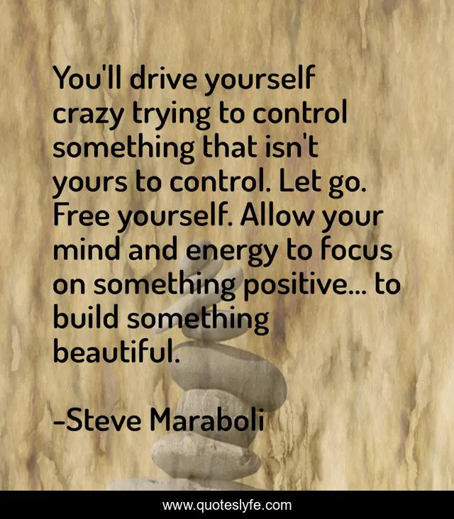 This page presents the quote "You'll drive yourself crazy trying to control something that isn't yours to control. Let go. Free yourself. Allow your mind and energy to focus on something positive… to build something beautiful.". Author of this quote is Steve Maraboli. This quote is about control, crazy, letting-go, freedom, confidence, let-go, positive, inspiration,.