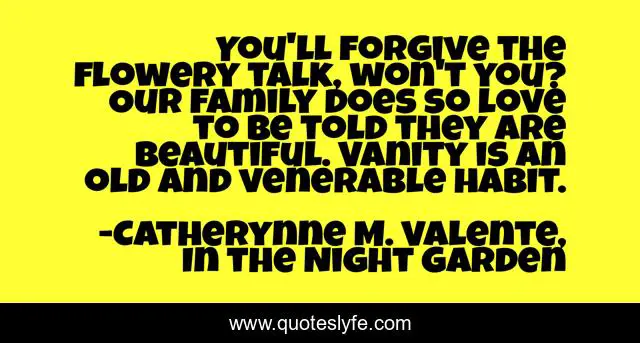 This page presents the quote "You'll forgive the flowery talk, won't you? Our family does so love to be told they are beautiful. Vanity is an old and venerable habit.". Author of this quote is Catherynne M. Valente, In the Night Garden. .