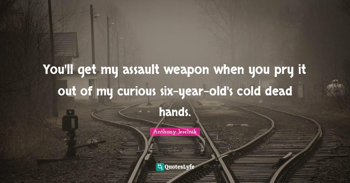 This page presents the quote "You'll get my assault weapon when you pry it out of my curious six-year-old's cold dead hands.". Author of this quote is Anthony Jeselnik. This quote is about cold, assault, hands, assault weapons, six, curious, years,.
