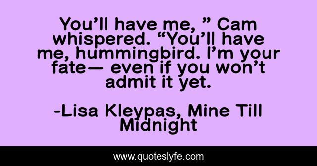 This page presents the quote "You’ll have me, ” Cam whispered. “You’ll have me, hummingbird. I’m your fate— even if you won’t admit it yet.". Author of this quote is Lisa Kleypas, Mine Till Midnight. This quote is about cam-to-amelia, fate,.
